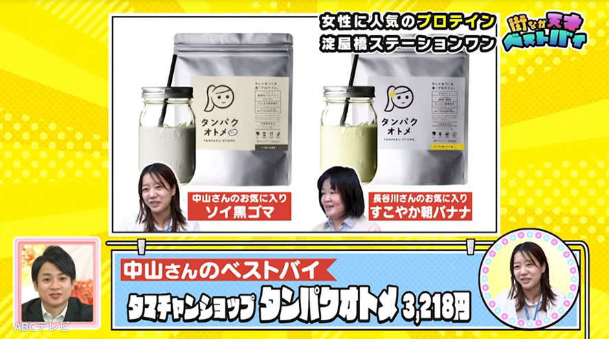 会社の同僚と一緒にいた女性のベストバイは、「(朝ごはんとして)毎日飲んでいます!」というタンパクオトメです。タンパクオトメは、累計315万袋を販売した人気プロテイン。さまざまなフレーバーがあり、女性はソイ黒ごま、彼女にタンパクオトメを紹介した同僚は、一番人気のすこやか朝バナナ、そしてますみは博多あまおうがお気に入りです!