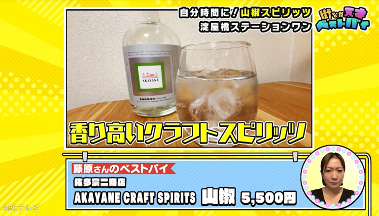 30階のYODOYABASHI SkyTerrace Cafe & Barでランチ休憩中の女性・藤原さんは、山椒クラフトスピリッツがベストバイ! このスピリッツは、鹿児島県の佐多宗二商店の商品で、蔵の当主がフランスで蒸留酒の世界的権威から製法を学んで生み出しました。藤原さんはロックで飲むそうですが、ソーダや水で割っても山椒の香りはそのままに楽しめます。彼女いわく「アテなしで飲める!」とのことで、おいしすぎて2週間ほどで空にしちゃうのだとか!