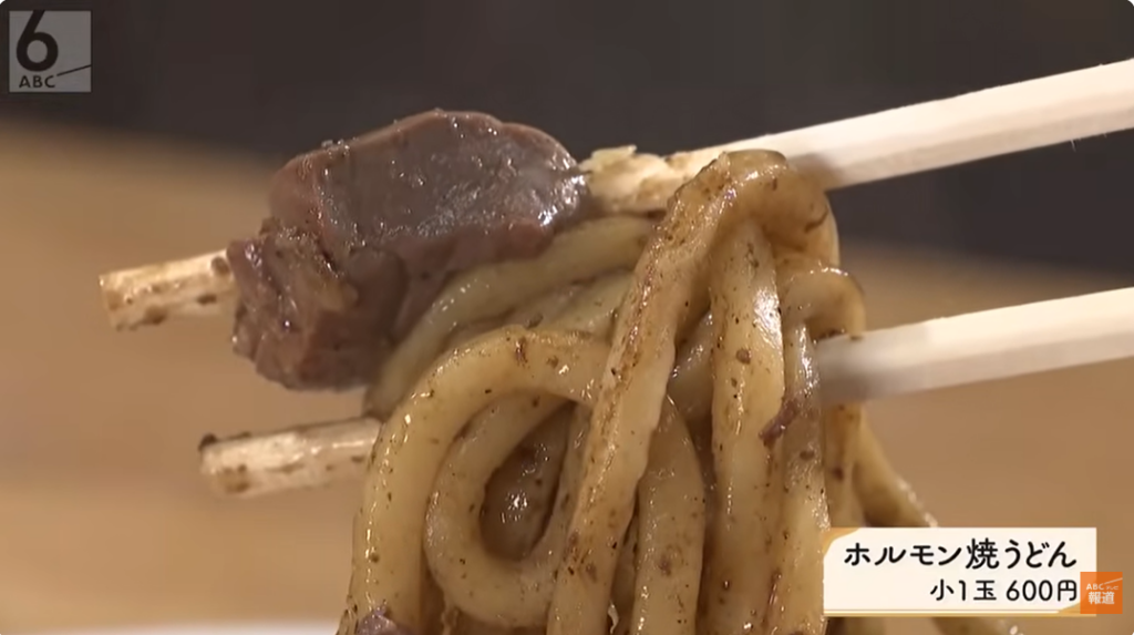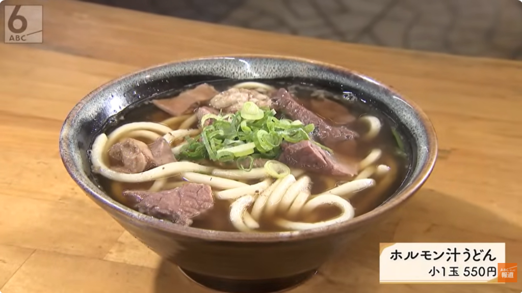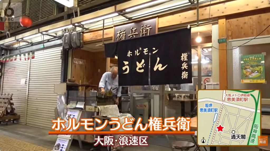 大阪市浪速区、新世界市場のアーケードの出口付近に店を構える「ホルモンうどん権兵衛」は、4人掛けのテーブルが2つとカウンターだけの小さなお店。名物のホルモンとキャベツが焼きうどんの上にドーンとのった「ホルモン焼きうどん」。ホルモンの旨みがだしに溶け込む「ホルモン汁うどん」も人気です。