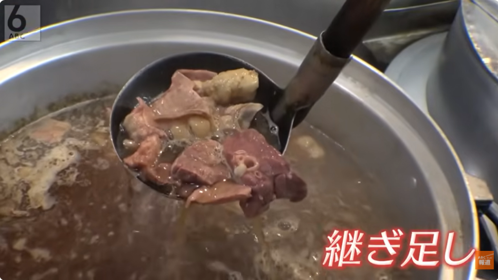 自慢のホルモンは、生の状態から2回煮込んで柔らかくし、下味をつけたら大鍋の中へ。創業時からずっと「継ぎ足し」を続けて変わらぬ味を受け継いでいるそう。両親の時代から継ぎ足すこと80年! このホルモンは、まさにお店の魂です。