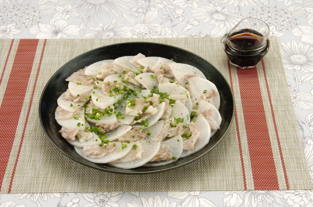 (2)耐熱の皿に大根と豚肉を外側から交互に円状に並べ、塩、こしょう、酒をかけ、ふんわりとラップをかけて600Wの電子レンジで6分加熱する。