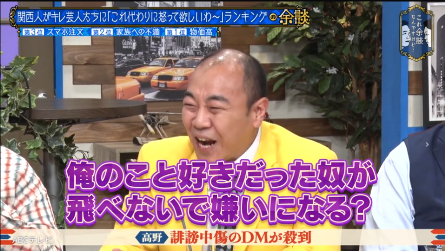 濱家が「確かにな。わかるわかる。『飛べる俺が好きやったん?』っていう」と理解を示すと、高野は「そうですよ。今まで飛んでる俺なんか見せたことないんだし」とヒートアップ。相方の岸が「飛べそうだから好きだったんじゃない?」とDM発信者の気持ちを推測すると、高野は「俺が飛べそうだから好きだったの?お前は!」と嘆き、濱家はテーブルを叩いて大笑い。