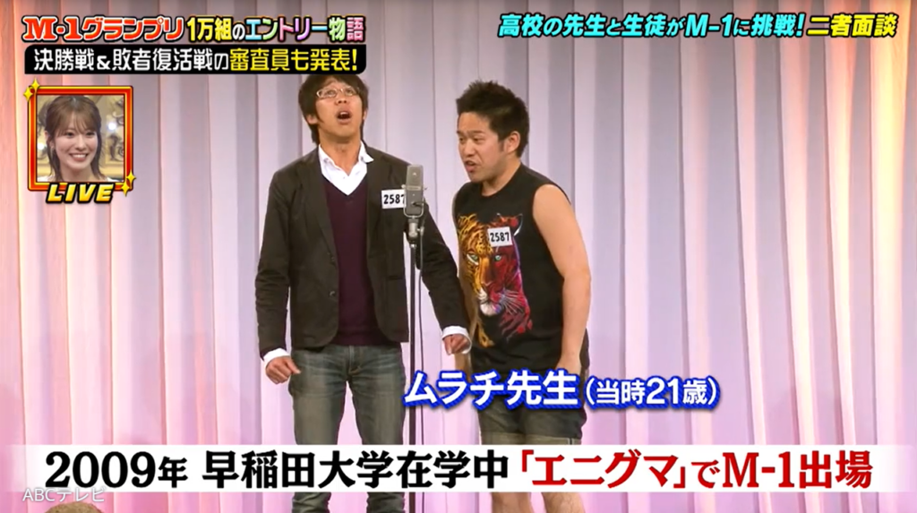 実はムラチ先生は、かつて早稲田大学の漫才サークルに所属。在学中にお笑いコンビ「エニグマ」として『M-1グランプリ』に出場し、2年連続2回戦進出という実績があった。しかも当時の彼の相方は、現在ピン芸人として活躍する、ひょっこりはんだった! こうした過去を活かして現在ムラチ先生は、漫才を通して生徒たちの表現力や挑戦する力を育てている。