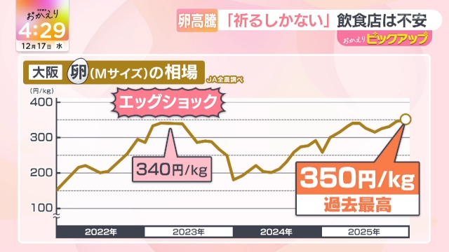 大阪の卵(Mサイズ)の卸売価格は一昨年のいわゆる”エッグショック”の水準を超え、1kgあたり350円と過去最高値。