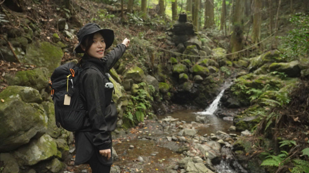 今回は小仏峠を通って山頂を目指すコース。最寄りのバス停から、住宅地の間を抜けて山へと続く緩い坂道へ。途中寄り道をしながら歩くこと小一時間、ようやく小仏峠登山口に到着です。登山道に入ってすぐに現れたのは小仏滝。なんでも、滝行をする人のために地元の人たちが協力して作った人工の滝とのこと。「いつか滝行やってみたいんですよ」と興味津々の美山さん、その日が楽しみですね。