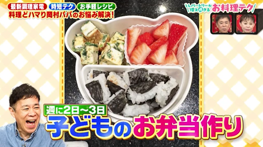 岡村は毎日忙しいにもかかわらず、1週間に2~3回のペースで我が子の弁当を作っている。しかし、料理のレパートリーが多くないため、残念ながら子どもは「飽きるんでしょうね。全部残したり」するそうだ。