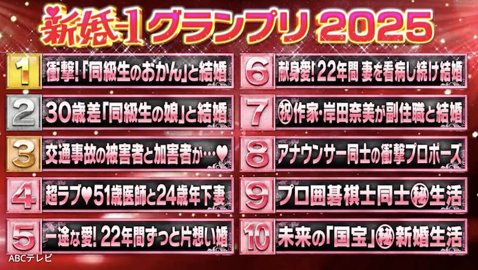 どのエピソードも強烈な印象を残すこの番組。2025年の新婚さんも、ふたりを繋ぐ“何か”に引き寄せられゴールインしている様子が、まさに「小説より奇なり」だ。
