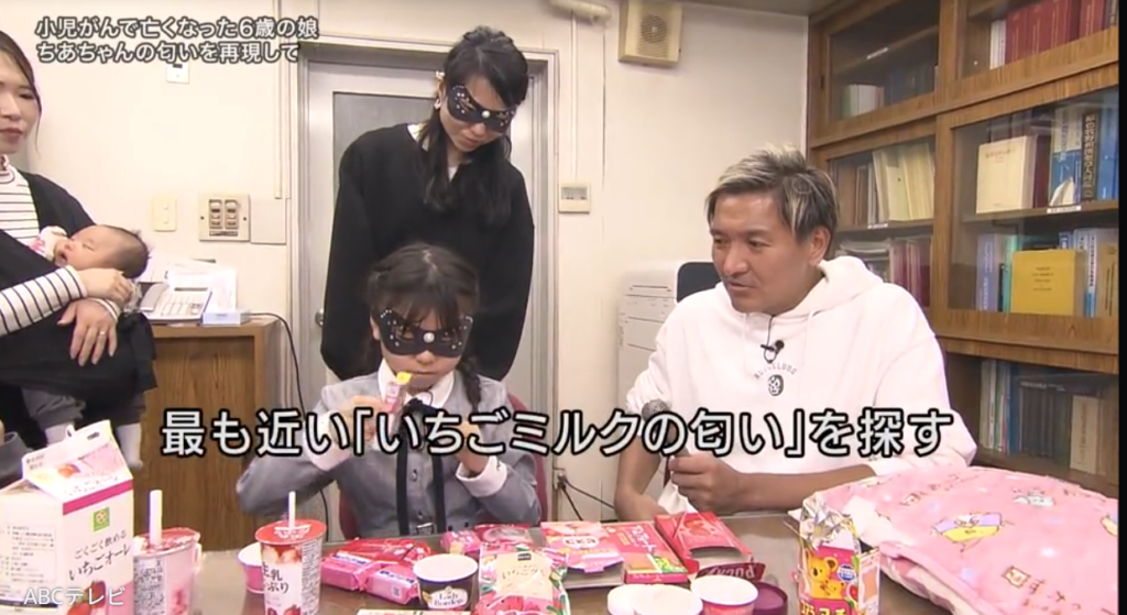 ご両親が固唾を飲んで見守る中、絶対嗅覚少女が枕の匂いを確認し、「匂いはあります」「いちごミルク系」と分析すると、依頼者の妻が「いちご大好きでした」と驚きの表情に。そういえばわんこのぬいぐるみにも、「いちごちゃん」と名付けていた! 絶対嗅覚少女が嗅ぎ取った匂いを山本香料で再現できるかもしれない!