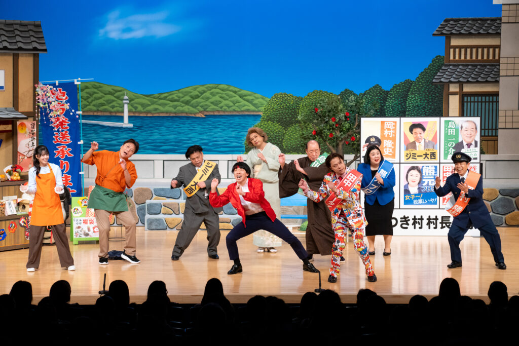 そんななか、現村長の後援会の会長で、とんでもない大金持ちの“村一番の有力者”役で登場するのが、御年82歳で2026年には芸歴60年を迎える池乃めだか。おなじみのオレンジ色のド派手なスーツでめだかが舞台に現れると、客席から大喝采が。「どこにおるんや?」「声は聞こえるけどな」と探し回る岡村らに、「♪見下げて〜ごらん〜」と歌って存在をアピールする十八番ギャグが披露されると、会場は大きな笑いに包まれた。