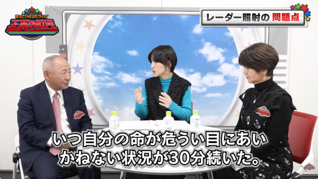 30分間レーダーを照射した今回は「捜索レーダーだと30分集中的にやる必要はないわけですよね。やっぱり、狙ってるということですよね」と解説する。さらに、「僕はおそらく戦闘機の方は警報が鳴って射撃管制レーダーが照射されたという、そういう証拠もつかみ判断もしたと思います」と語った。