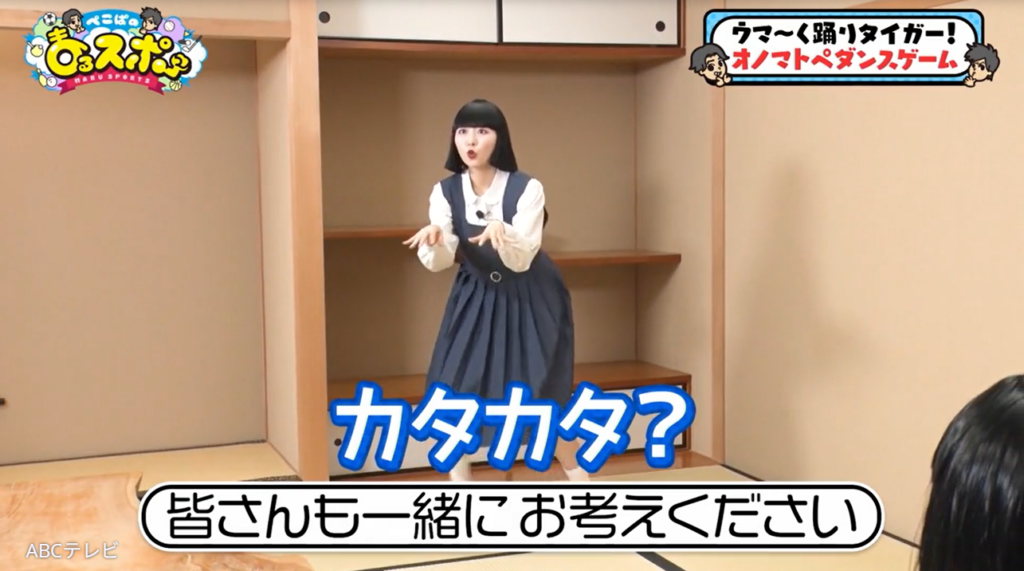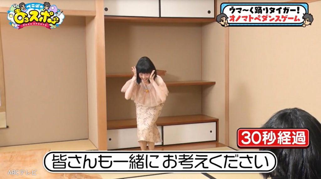 アバンギャルディ化した面々は、ぺこぱチーム(ぺこぱ&新貝アナ)と石井投手チーム(石井投手&アバンギャルディkohana、oya)に分かれて、ダンスジェスチャーゲームで対決! オノマトペの問題をダンスで表現し、1分間の正解数を競い合うことになった。