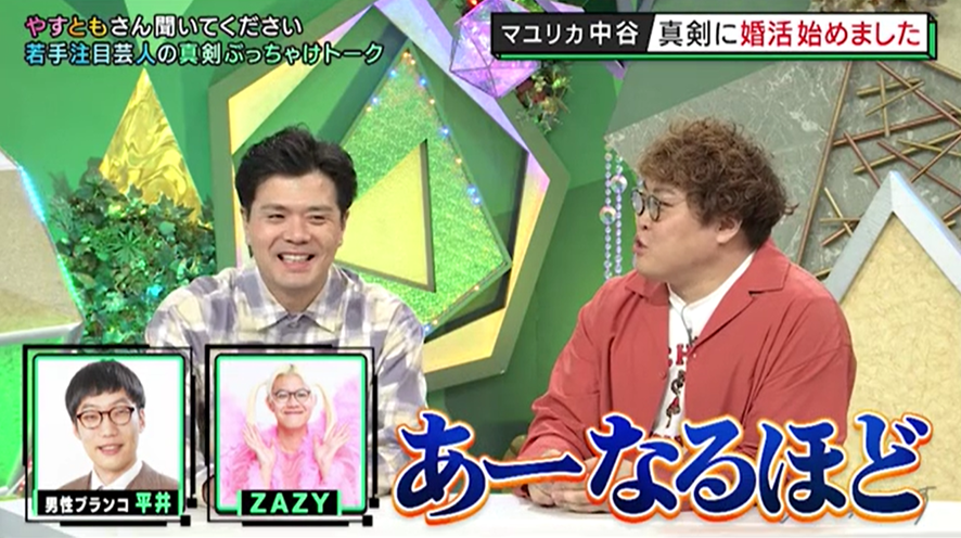 そんなマユリカの中谷が、「結婚したい」と切実な胸の内を明かした。相方の阪本が2024年末に結婚を発表し、同期で独身なのが、自分と平井まさあき(男性ブランコ)とZAZYだけなため、非常に焦っているらしい。海原ともこ(海原やすよ ともこ)は、独身3人に共通点を見出したのか、「あ~なるほど……」とだけ発してニヤリ。彼女の意味深長なリアクションに、スタジオ一同は思わず笑った。