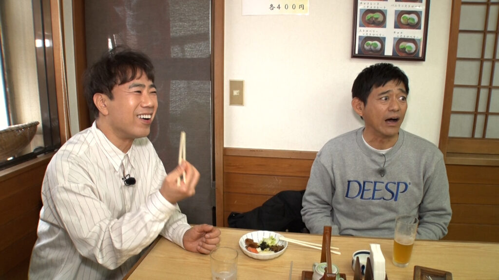 ロケが始まって早々に、華丸がとあるカフェに吸い寄せられ、流れるように梅サワーをテイクアウトする。その味に、華丸が「ありがとうございます」と感謝した。藤井の分の飲み物を物色しながら表参道を歩いていると、見るからに老舗の酒屋さんを発見! 明治時代から続く蔵元の直売店では、10種類以上の日本酒の試飲が可能。コイン式の試飲機に大はしゃぎする2人のおじさんの食レポならぬ酒レポにもご注目を。藤井の代表曲「ナンダカンダ」のサビを突然踊り出す華丸も必見だ。