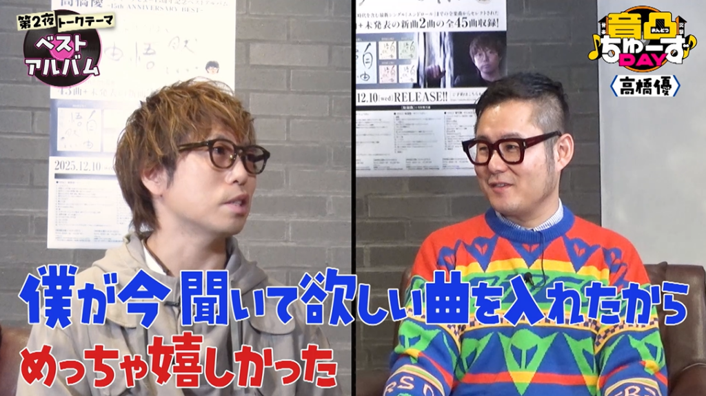 下埜が自身の職業柄、DISC3に収録された曲「PERSONALITY」を聴くと「グッとアガる」と伝えたところ、優さんはこの曲を「アルバムの最後に入れた知る人ぞ知る曲」だと語り、「僕が今聞いて欲しい曲を入れたんです。だから、めっちゃ嬉しかったです」と話してくれました! これには下埜も「うわ、嬉し! “45曲分の1”当てた!」とニッコリ。