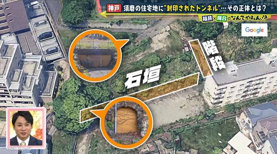“封印されたトンネル”は、3メートルほどの高さ。周囲を石垣で囲まれ、閉ざされた部分には蔦が這っている。これをABCテレビの福井治人アナウンサーは「鉄道の開通により不要になった歩行者用トンネル」、タレントの河合郁人は「この石垣自体が何らかの施設でトンネルはその一部」と予想した。