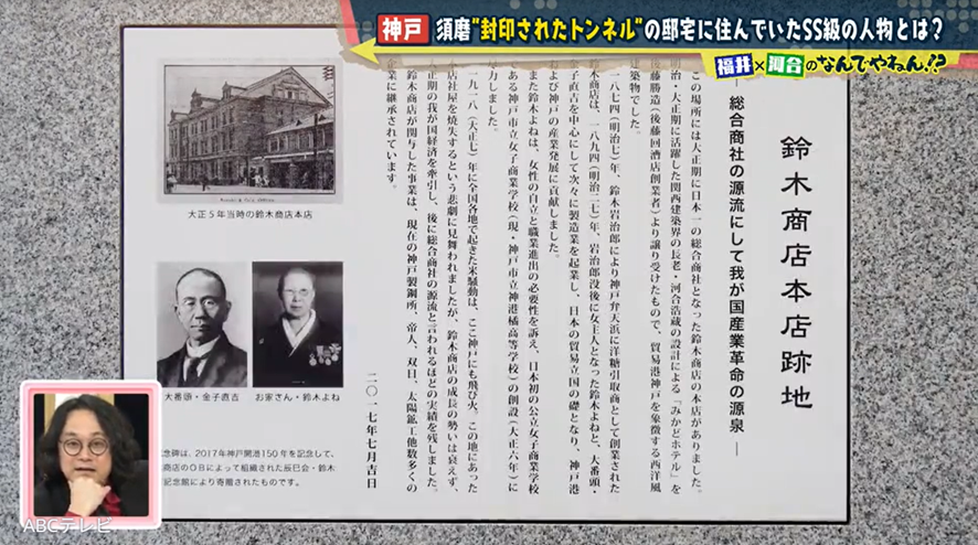 その近くで福井アナと河合は、鈴木商店本店跡地の石碑を発見した。説明文によると鈴木商店は、「大正期に日本一の総合商社となった」「総合商社の源流にして我が国産業革命の源泉」。その女主人・鈴木よね氏は、「次々に製造業を起業し、日本の貿易立国の礎となり、神戸港および神戸の産業発展に貢献」したという。