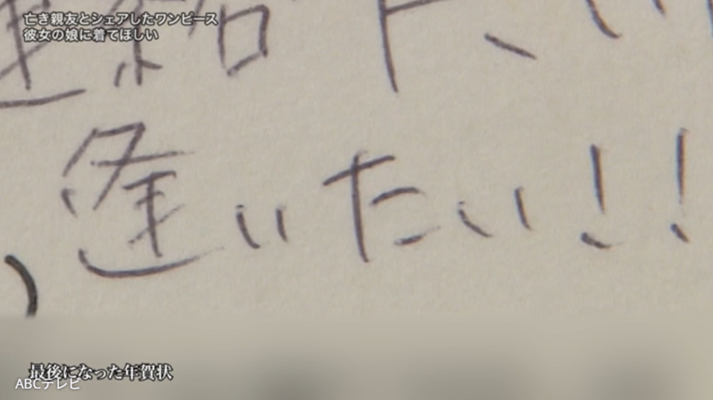 依頼者は19歳のときに佐賀県の看護学校で出会った親友と、自分のワンピースをシェアするほどの仲良しに。依頼者が27歳で結婚して佐賀を離れてからは、年賀状のやりとりだけで繋がっていた。44歳のときに届いた年賀状に、初めて「逢いたい」という言葉が添えられていた。依頼者は父親が癌で入院中のため余裕がなく、落ち着いたら連絡しようと思っていたところ、数ヶ月後に親友の訃報が届く。「逢いたい」という言葉の意味をようやく理解し、ご家族のもとへ駆けつけた依頼者は、見せてもらったアルバムにあのワンピースを着た親友の写真を見つけ、涙が止まらなかったそうだ。