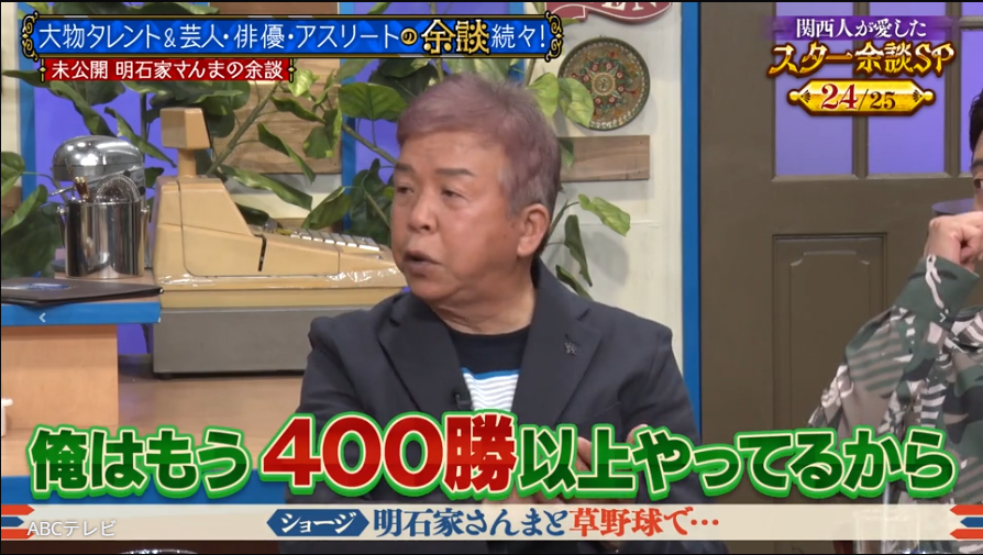 さんま監督の草野球チームに所属する芸人とは、芸歴45年目のベテラン、村上ショージのこと。チームのエースとして年間70試合をこなし、400勝以上していると明かすと、濱家は「金田正一、金やん以来ですやん」とNPB史上唯一の400勝投手の名前をあげてツッコんだ。