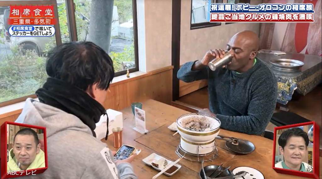 多気町は鶏焼肉が有名ということで、ボビーは町の有名会長から教えてもらった炭火焼肉店「きみや」へ。そこでボビーは常連客の年下男性に、「いいか、いいか。奥さんは辛いかもしれないけど、我慢しろ。俺は我慢できなかったからな」と年長者としてアドバイス。続けて「警察呼ばれたんだよ」と、活動自粛の原因である夫婦トラブルについて笑いながらサラッと触れ、常連客と千鳥を驚かせた。