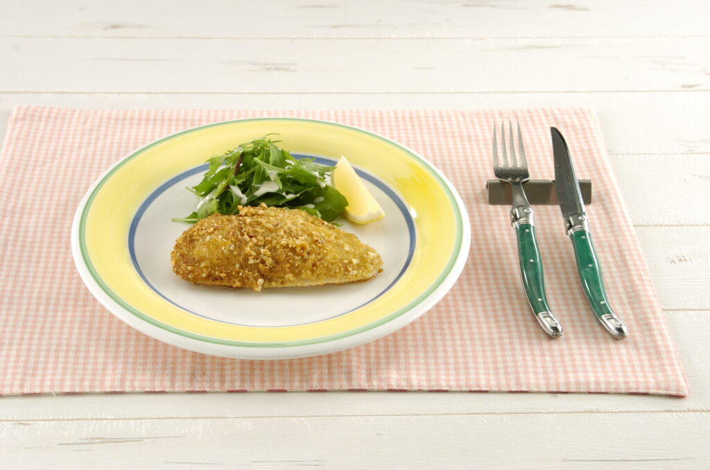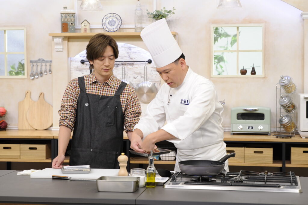 この日のテーマは「しっとりおいしい!鶏胸肉」。パサつきがちな鶏胸肉をしっとりジューシーに仕上げるレシピ「鶏のナッツパン粉焼き」を辻調理師専門学校の大西章仁先生から教わった。
