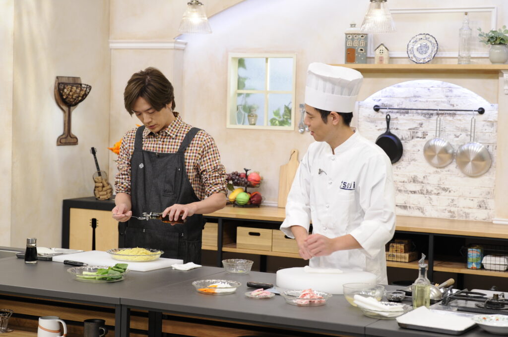 あんを使った料理はDAIGOも好きらしく、先生の“あん作り”に興味津々。炒めた具材の上から、片栗粉などの調味料を合わせたスープが一気に投入され、ジューッという音とともにもうもうと湯気が立つと、「うわ〜っ!」と思わず声が。さらに火が入り、ゆっくりととろみを増していくあんに「あ〜、ご飯にもかけたい」「おいしそうだ!」とワクワクが止まらない。