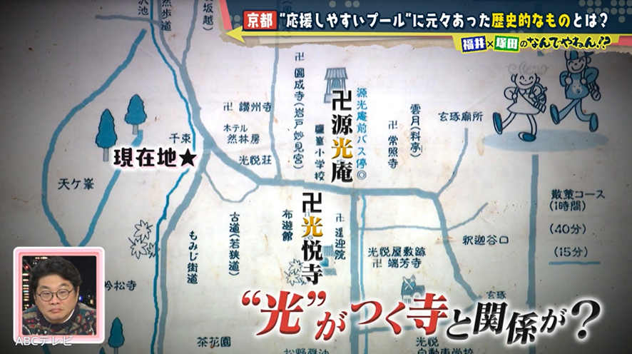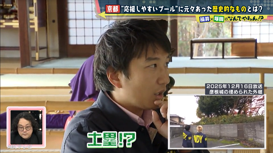 鷹峯の地図を見た福井アナと塚田は、「“光に導かれる”とは『光』がつくお寺と関係がある」とひらめき、手当たり次第行ってみることに。そのうちの1つ・源光庵は、1346年開創の曹洞宗の寺院だ。福井アナは、そんな寺の本堂にある「悟りの窓」で悟りを開いたのか、めっちゃ応援しやすいプールが以前調査した“滋賀・彦根城の外堀の土塁”と似ていることに気づき、「鷹峯にあればそれが答え」と考えた。