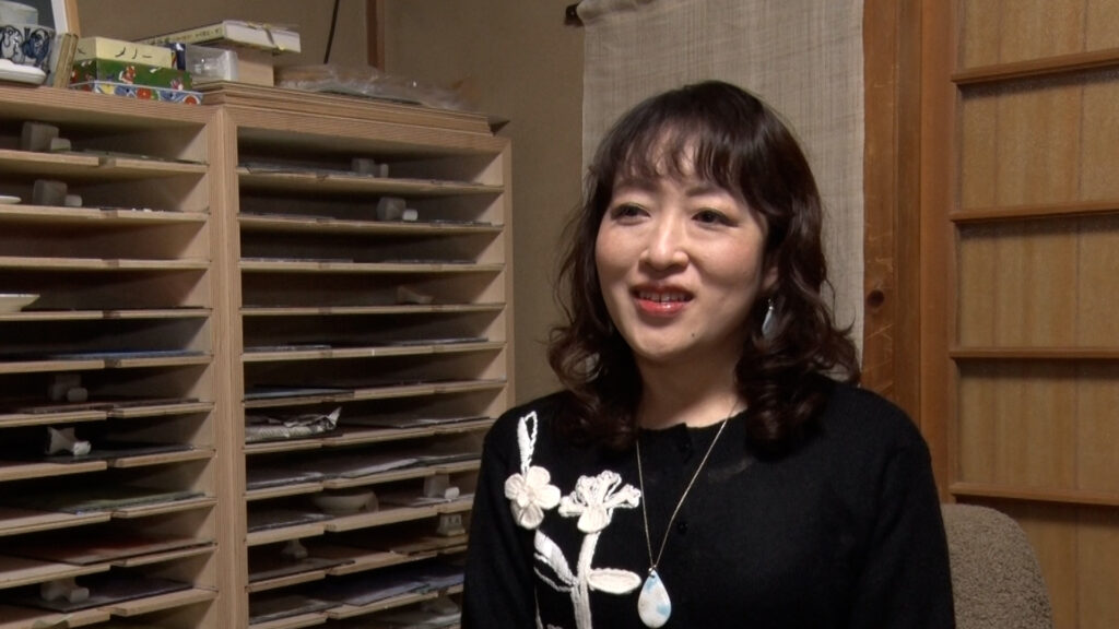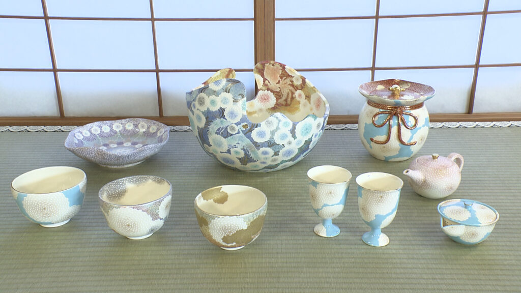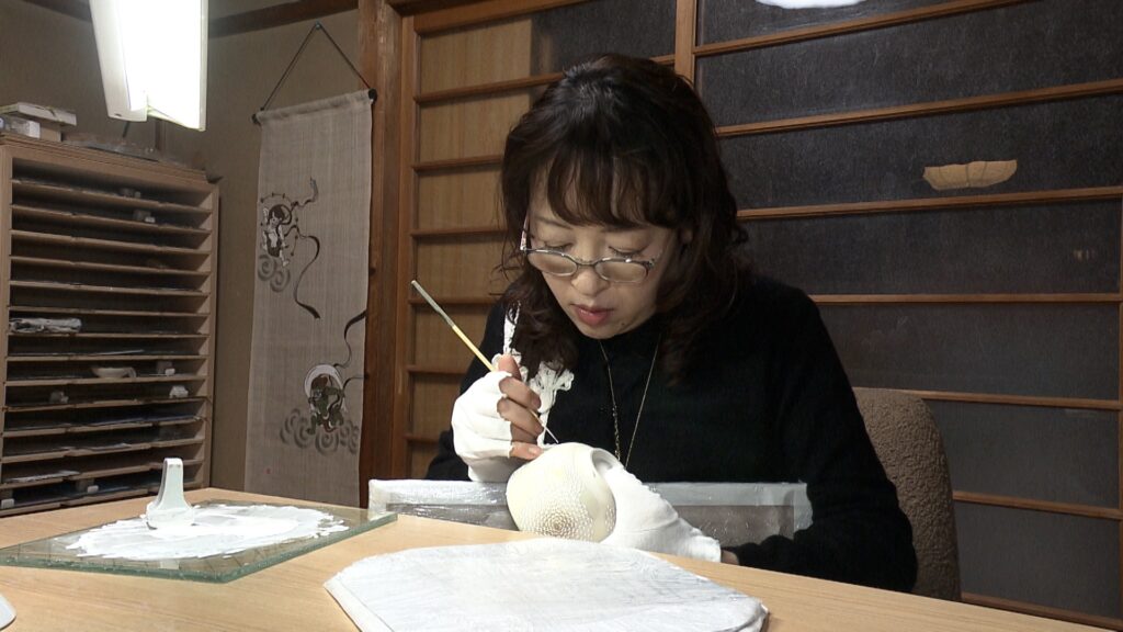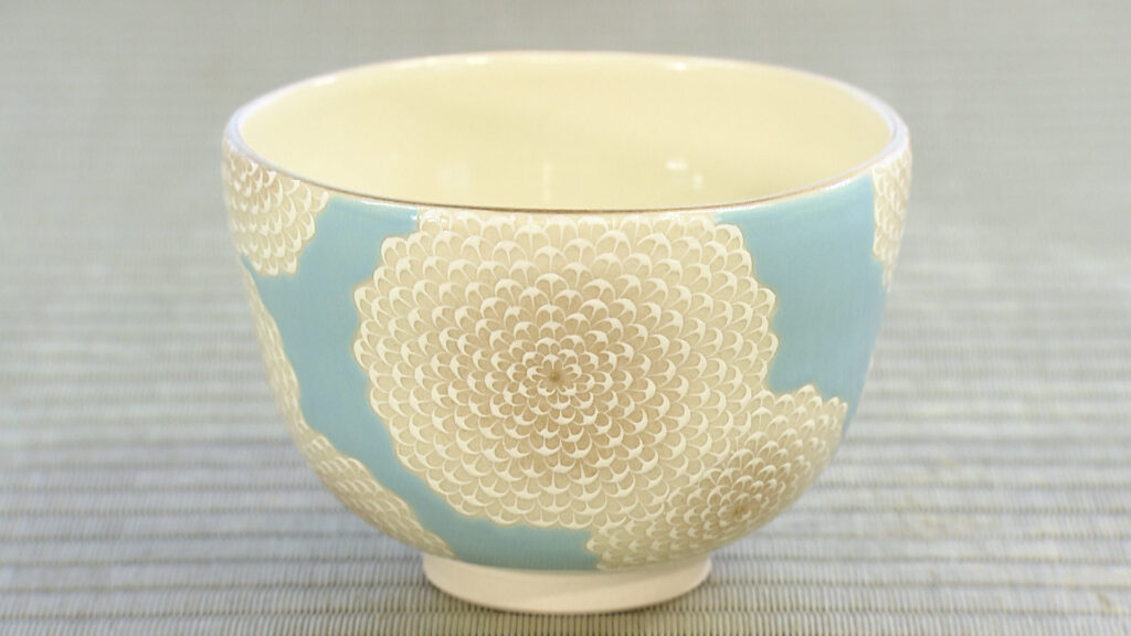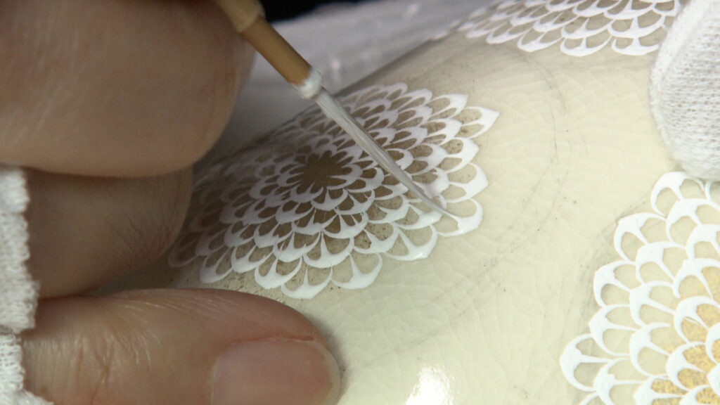 「京焼・清水焼」と総称される京都の陶磁器は、およそ400年前から制作されてきた伝統工芸品。現在、京都市に自宅兼工房を構える上坂妙さんは、2016年に京都を代表する絵付師の山岡昇さんの工房で修業を始めました。そして、3年後の2019年に独立。修業期間をわずか3年で終えることができたのは、上坂さんが絵付けした「白菊」の絵を師匠が認めてくれたからでした。驚くほど細密な絵が施された「白菊蒼穹茶盌」。近くで見ると、細かく描き込まれた花びら1枚1枚に絵具がこんもり浮き上がっているのがわかります。この小さな凹凸が模様に自然な奥行きを生むのです。