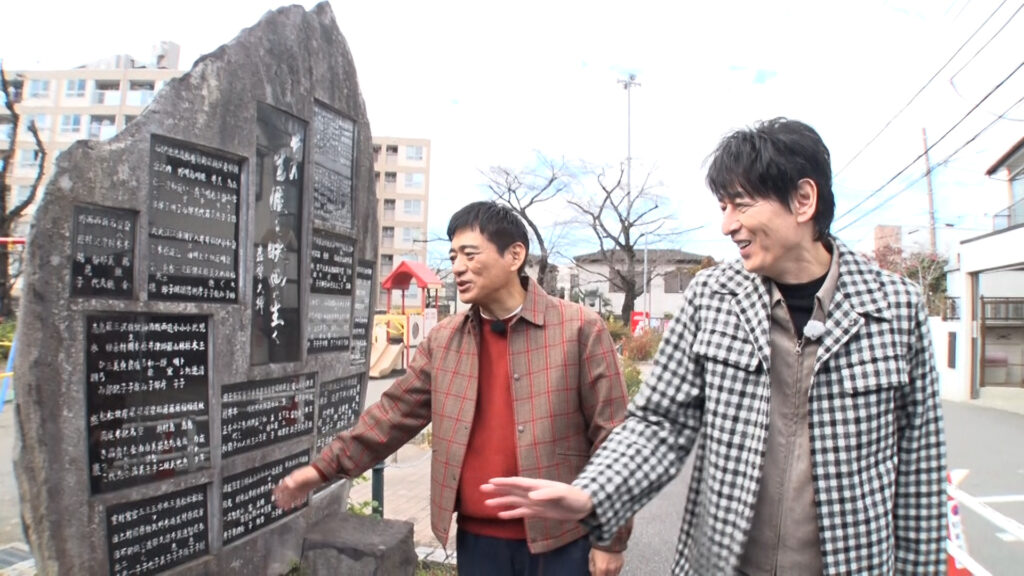 調布には、映画にまつわるスポットが点在する。大魔神像が出迎える角川大映スタジオを通り過ぎた2人は、すぐ近くに建つ「映画俳優の碑」の前で足を止め、そこに刻まれた映画スターたちの名前をじっくりとチェックする。博多華丸・大吉にとっての恩人・児玉清の名前や、「発起人」の欄にある高倉健、勝新太郎、菅原文太、三船敏郎、森繁久彌ら錚々たる名前に盛り上がる一方で、とある超有名人に華大がひっかかってしまう一幕も(笑)。