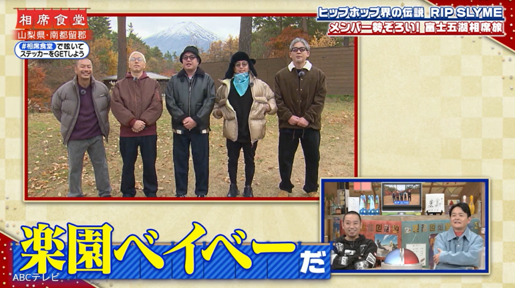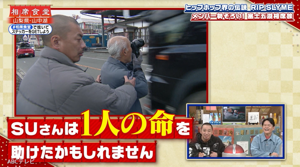 なお、SUたちRIP SLYMEの富⼠五湖ロケVTRは、『相席食堂』1月20日放送回で公開された。次週1月27日放送の『相席食堂』では、引き続きRIP SLYMEの衝撃ロケVTRが公開されるほか、メンバー5人が語る感動秘話が明らかになるので見逃せない!