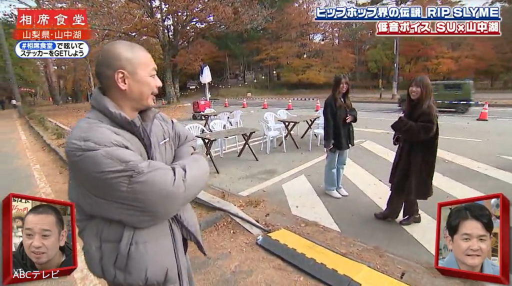 富⼠五湖で⼀番東京に近い山中湖にやって来たのは、低音ラップと独特のワードセンスが持ち味の52歳クセ者MC・SUだ。「⼥の⼦って、引きで⾒るよりこのへん(近く)で⾒た⽅が大概かわいい」と持論を語るSUは、若い女性たちを発見するや否や、「なんか食べません?」「何食べたの? それおんなじもん食べるわ!」などと積極的に話しかけた。