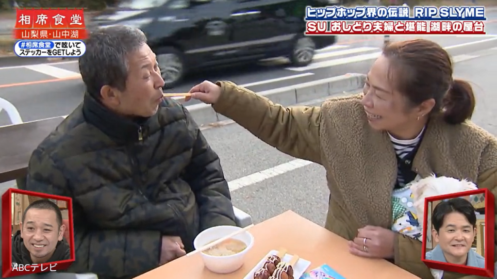 さらにSUは、「もう“アーン”なんて何年もやってないんじゃないっすか?」「“アーン”したくないすか?」と夫婦にたずね、妻から夫へ屋台グルメを食べさせるように提案。実は夫婦にとって、“アーン”は初めての体験。照れながらも初めての“アーン”をする夫婦は笑顔で、愛が深まった2人にSUも嬉しそうだった。