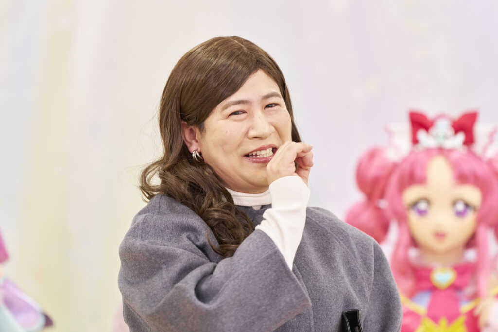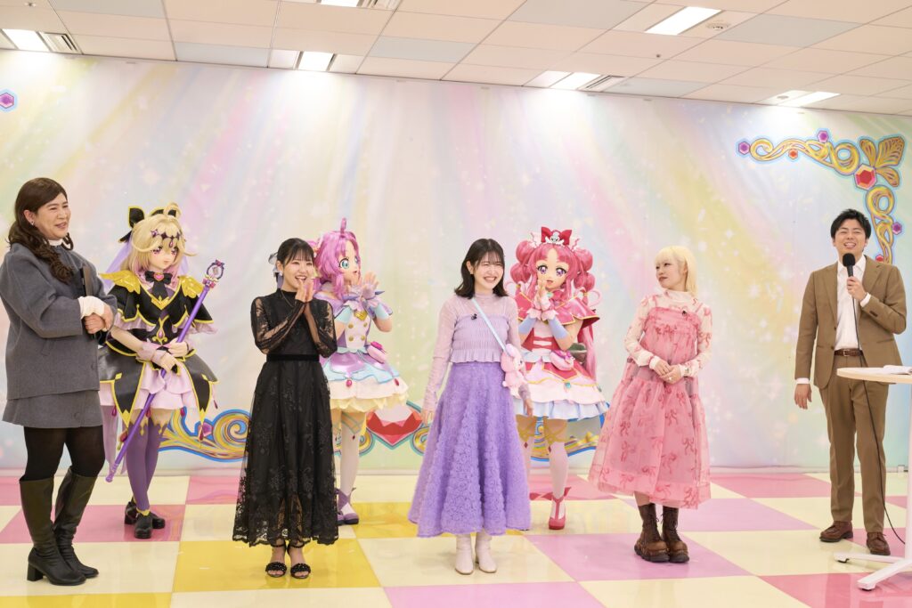 続いて、千賀光莉・本渡楓・東山奈央・キュアアンサー・キュアミスティック・キュアアルカナ・シャドウ、そして番組プロデューサーであるABCアニメーション・多田香奈子に変装したコットンきょんが登壇。「私がABCアニメーションそのもの!」と言い張るきょんに、西村が「ABCアニメーションを具現化した人間ということですか!?」と応じるなど楽しいやりとりが繰り広げられ、会場は笑いに包まれました。