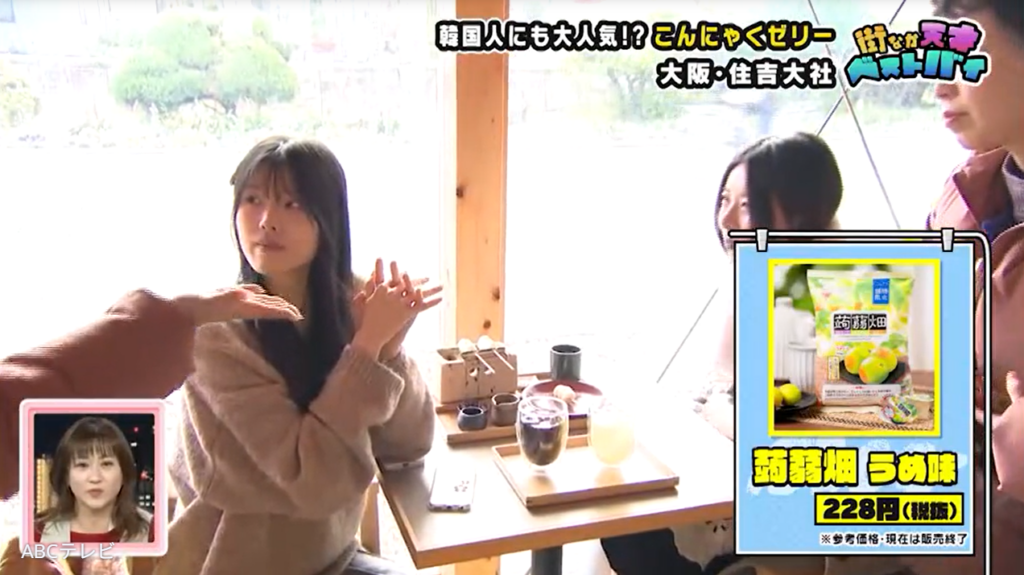 住吉大社近くの住吉公園は、2024年に園内にオープンした飲食店街・汐かけ横丁を訪れる人たちで賑わっています。自分で団子を焼いて食べられる和カフェ・兎茶やには、韓国人女性たちの姿が。女性たちのベストバイは、蒟蒻畑のうめ味(現在販売終了)。彼女たちいわく「こんにゃくのゼリーは韓国にない」らしく、蒟蒻畑は「おいしい!」の一言に尽きるそうです。