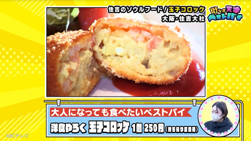 3歳の娘と公園で遊んでいた女性は、もともとこのあたりに住んでいたそう。彼女のベストバイは、引っ越した後もわざわざ買いに来るという、創業以来90年の老舗洋食店・洋食やろく本店の玉子コロッケです! このコロッケは、ジャガイモを使わず、つぶしたゆで卵と牛乳、バターで作られている、住吉の大人気ソウルフード。女性は「子どものころから食べている」そうで、「優しい味で何個でも食べられる」と教えてくれました!