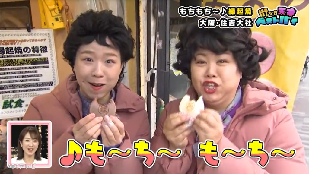 住吉大社を出た天才ピアニストは、「もちもちのもちもちのも~ち~も~ち~もっちも~ち~」という不思議な歌に引き寄せられ、縁起焼 住吉大社店へ。エンドレスで流れる録音の歌声の主は、周囲から「ええ声」と評判の男性店主です。この日は残念ながら不在でしたが、出勤時は本人の生歌が聞けちゃうんだとか!