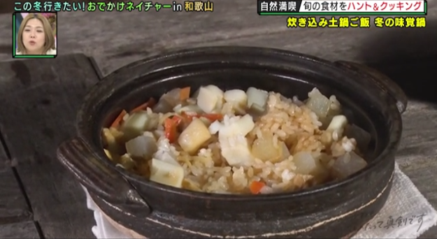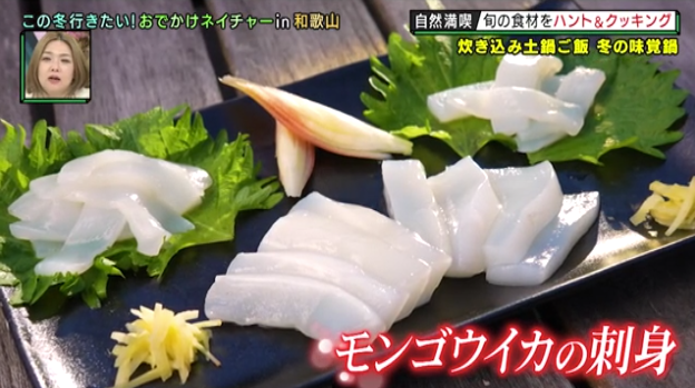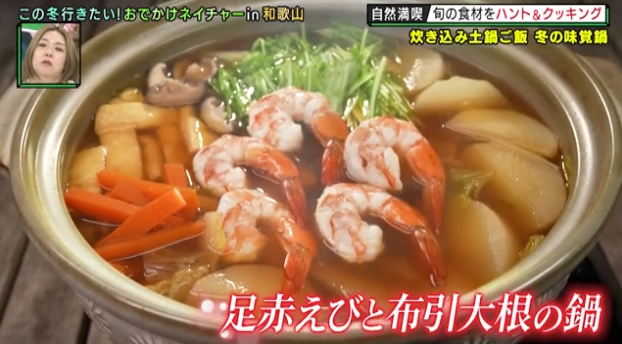 新鮮な食材で作った料理を次々と作っていく二人が最初に作ったのは“モンゴウイカの刺身”。さっそく食べた池田の感想は「速い!」。「うまいが(来るのが)速い」というぐらい、爆速の美味しさに思わず村田も「マッハマッハ」と応える。イカに布引大根や野菜を入れ湯浅醤油を馴染ませた炊き込みご飯を作りながら、和風だしにこれもまた湯浅醤油で味を付け足赤エビと布引大根を煮込んだ鍋は、見た目もお味もばっちりのネイチャークッキング。和歌山の自然を満喫し旬の食材でおでかけを満喫した二人だった。