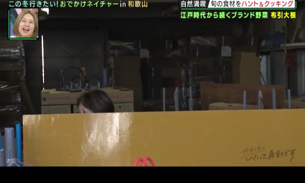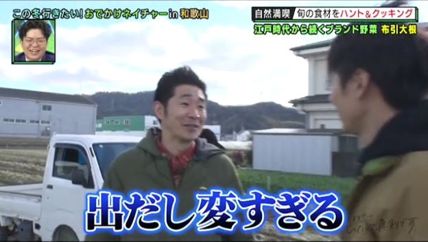 男性が畑で育てていたのは「布引大根」というブランド野菜。布引地区は江戸時代から大根栽培が盛んな場所。海岸に面しており「砂地」で栽培している様子に二人はびっくり。なんでも、水はけのよい砂地で育てることにより甘みの強い大根が育つのだとか。冬の大根は今が収穫の最盛期。さっそく池田は抜きにかかるが、かなり引っ張らないと抜けないのでは?という想像を裏切り意外とすんなり抜けてしまう。「鼻毛抜くよりも簡単っすね~」と興奮する池田にまたしても村田が鋭くツッコむ。