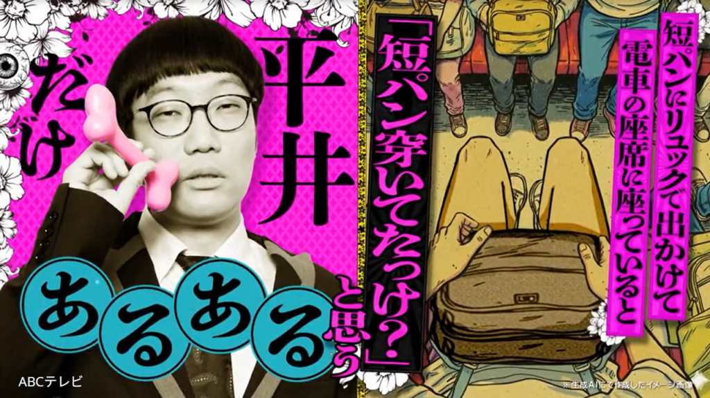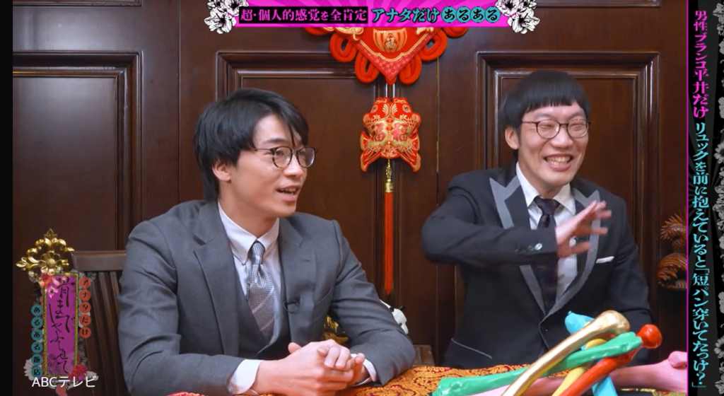暴露のきっかけは、男性ブランコ・平井まさあきの「短パンにリュックで出かけて電車の座席に座っていると、『短パン穿いていたっけ?』と思う」というエピソード。毎回平井は、「俺パンツ(だけ)で来ている?」という不安でいっぱい。リュックを普通にどけて確認する勇気を持てず、モゾモゾ動いて尻の感覚だけで探り、最終的には観念して、周囲に見られないように、リュックをそ~っと前にずらして確かめるのだとか。