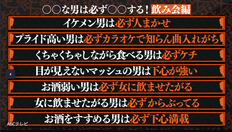 【TVer】関西女子100人に穴埋め持論調査!経験したから間違いない!○○な男は必ず○○する!「飲み会」「恋愛」「性格・本質」の3つのジャンルに分けて発表!