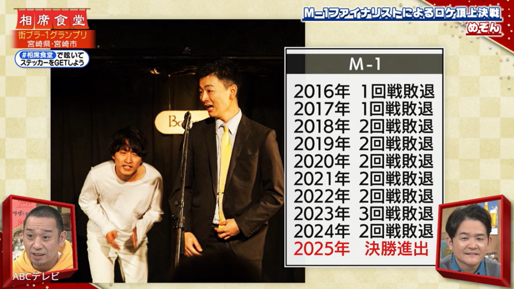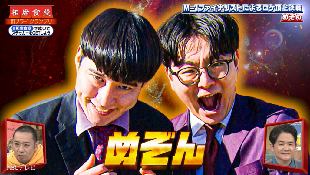 なお、確実に爪痕を残しためぞんの初ロケVTRは、『相席食堂』2月3日放送回で公開された。同放送回は、「街ブラ-1グランプリ2026」と題して、M-1ファイナリストたちが漫才ではなく、ロケで激突! めぞんのほか、ヨネダ2000と真空ジェシカも地元を訪れ、街ブラロケの面白さを競い合った。