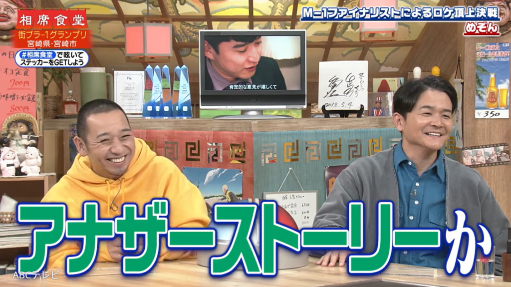 思ってもみなかった感動展開に加えて、男泣きするのが原ではなく吉野だったことに、スタジオの千鳥は「熱い奴やったんや!」「どのタイミングでボケようかなって考えているんじゃなかったんや!」と驚き。特にノブは、「『アナザーストーリー』か!」「『アナザーストーリー』の画角やがな、字幕と!」などと、毎年恒例のM-1ドキュメンタリー番組に触れて笑いを誘いつつ、大悟とともにめぞんの初ロケを称賛した。