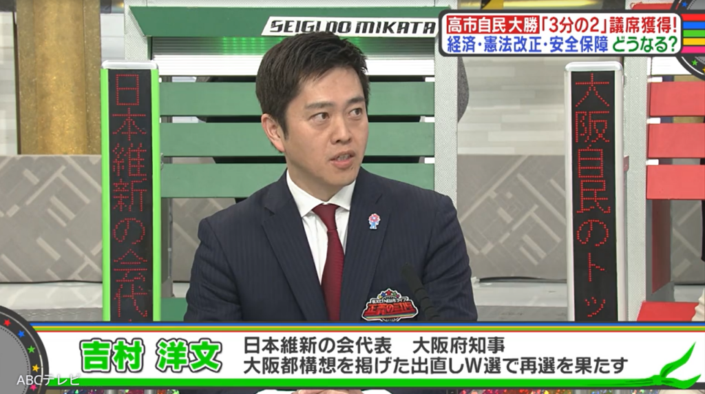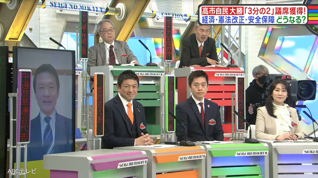 なお、今後の日本の政局の動きや政策は、2月14日に生放送された情報バラエティ番組『教えて!ニュースライブ 正義のミカタ』(ABCテレビ)で取り上げられた。同放送回には、維新の吉村代表や自民党の松川るい大阪府連会長のほか、参政党の神谷宗幣代表、中道改革連合の小川淳也代表が出演(小川代表はリモート出演)して、それぞれ自分の考えを主張した。