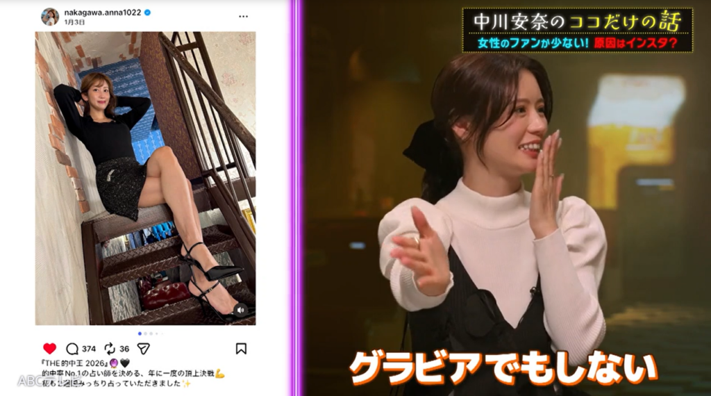 2025年3月にNHKを退社した中川は、フリー後に意欲的に活動しており、ドラマは「チャンスがあったら挑戦したい」とのこと。ちなみに彼女は戦略として、ボディラインが出る服を現在も好んで着ている。芸能界のライバルたちに差をつけるべく、「まだ脱いでないけど、脱いだら勝てるかもみたいな?」と冗談っぽく笑う中川に、ドラァグクイーンのドリアン・ロロブリジーダは、「何言ってんだ」と呆れ、スタジオに爆笑を巻き起こした。