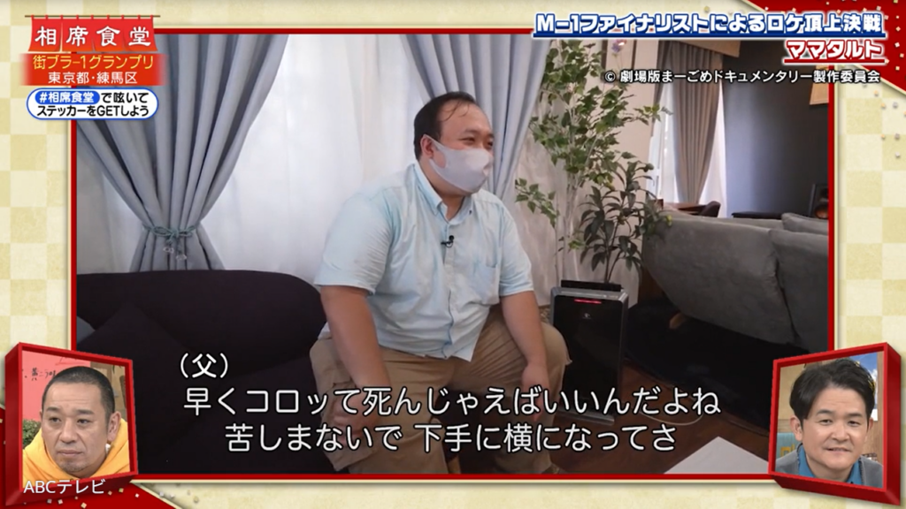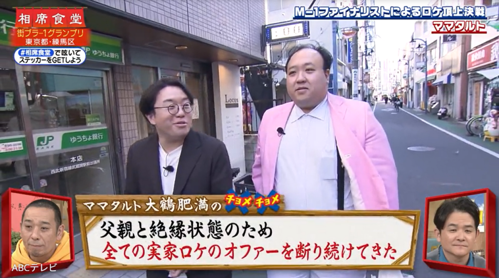 バラエティ番組『相席食堂』(ABCテレビ)に、漫才頂上決戦『M-1グランプリ2025』9位のママタルトが登場! 体重188キロのボケ担当・大鶴肥満が、4年半も絶縁状態の実の父親と和解すべく、東京都練馬区関町にある実家をツッコミ担当・檜原洋平と一緒に訪れた。