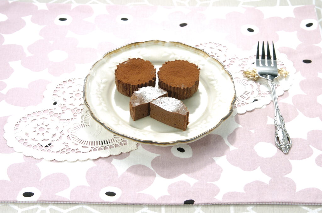 (6)(5)を取り出し、粗熱が取れてから冷蔵庫で2時間以上冷やし、ココアパウダーや片栗粉をふり、型をはずして器に盛る。