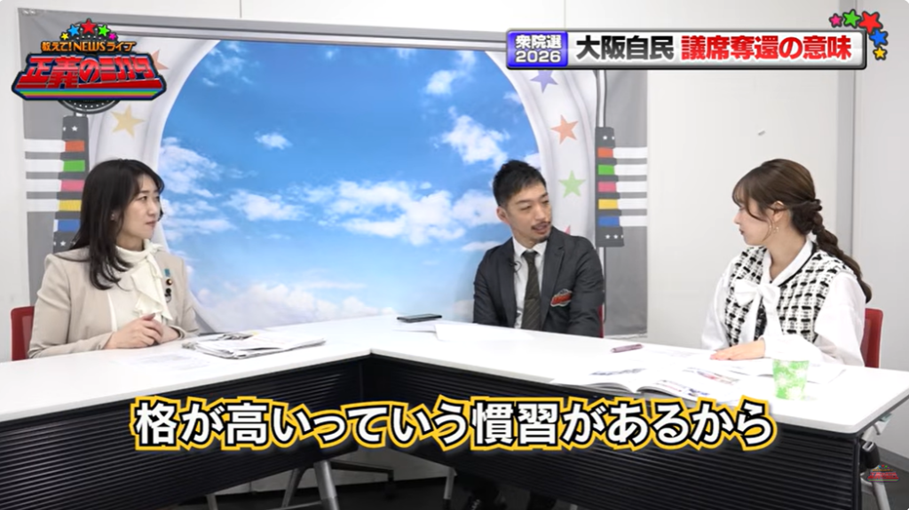「今回の選挙戦、どうご覧になりましたか?」と尋ねる久保アナに、「こんなに勝つとは正直思ってなかった」と答える松川氏。「こんなに有権者の皆様から、高市総理および日本を大転換するぞということについて大きな新任をいただいたのは本当に嬉しい驚き」と口にする。大阪府の自民党は、近年の国政選挙3つで全敗。それだけに、「大阪ではそうはいっても厳しい選挙だなと思っていたし、実際厳しかった」というが、小選挙区で1勝利、比例復活を合わせると7名の衆議院議員が誕生した。