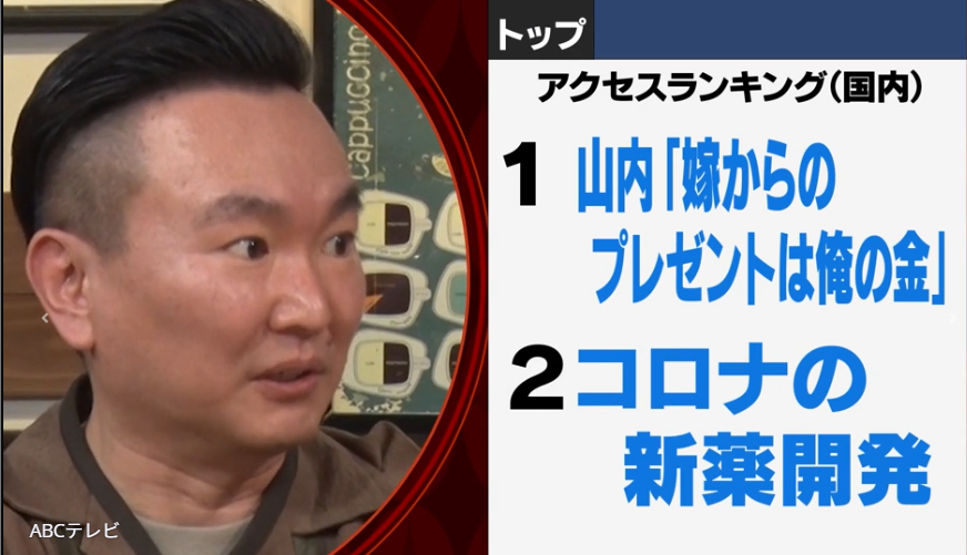 しかし、ネットやSNSでは「山内の金で嫁がプレゼント」みたいな感じで切り取られ大炎上。Yahoo!ニュースでは「コロナの薬開発」のニュースを抑え、トップに踊り出たこともあったのだとか。山内は「それを濱家が定期的に掘り返し、くすぶって鎮火しそうなところをもう1回燃え上がらそうとするから、(この話題が世間に)だいぶ浸透している」と話した。