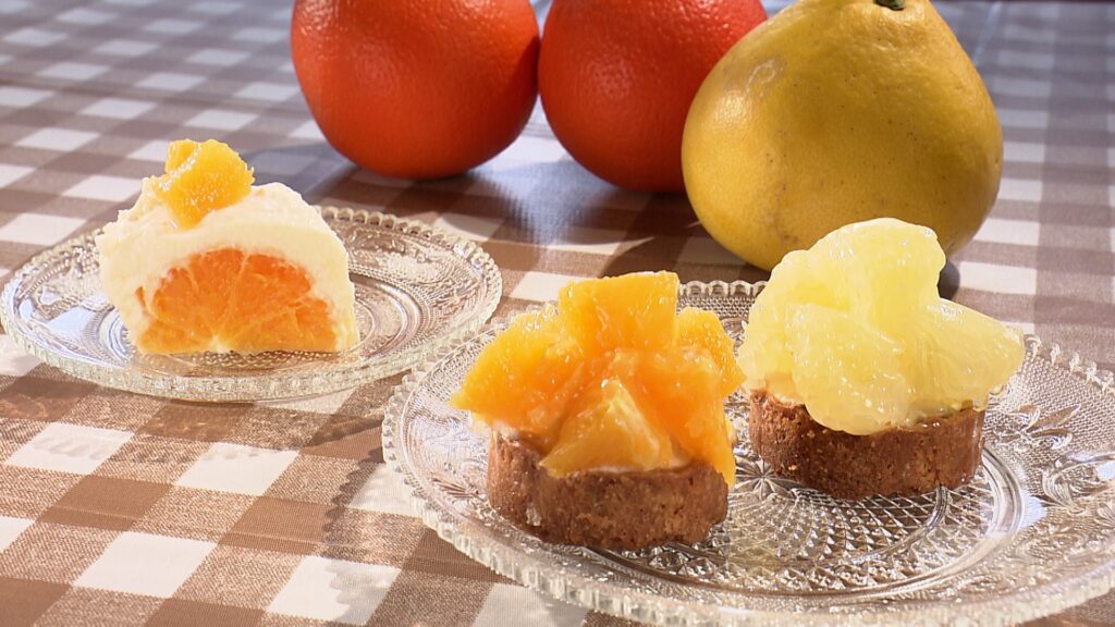 珈琲やスイーツにもこだわり、食材を厳選。今回は和歌山県かつらぎ町にある、まるひで農園の北岡さんを訪ねます。大前さんが大学生の頃に出会い、「柑橘を使うなら絶対にここ」と決めていました。早速、仕入れたネーブルと水晶文旦を使い、3月発売予定のスイーツ作りに取りかかります。独学でスイーツを作り始めた中里さん。和歌山産の柑橘をたっぷり使い、どんなスイーツを生み出すのでしょうか?新作スイーツを、柑橘を育てたまるひで農園の北岡さんご夫婦に試食してもらいました。