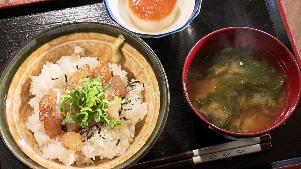 営業日の朝は魚を仕入れるため、朝7時に地元の鮮魚店へ向かいます。日高町は高級魚クエの本場として知られていますが、店で使うのは港に揚がったタイやグレなど、親しみやすい近海の魚が中心。仕入れを終えると、開店の準備に取り掛かります。大前さんはランチの仕込み、中里さんはスイーツ作りを担当。なかでも、魚料理は地元の漁師さん仕込みで、煮付けや漬け丼、ハタのお刺身といった海の恵みが存分に味わえると、常連さんからも評判です。