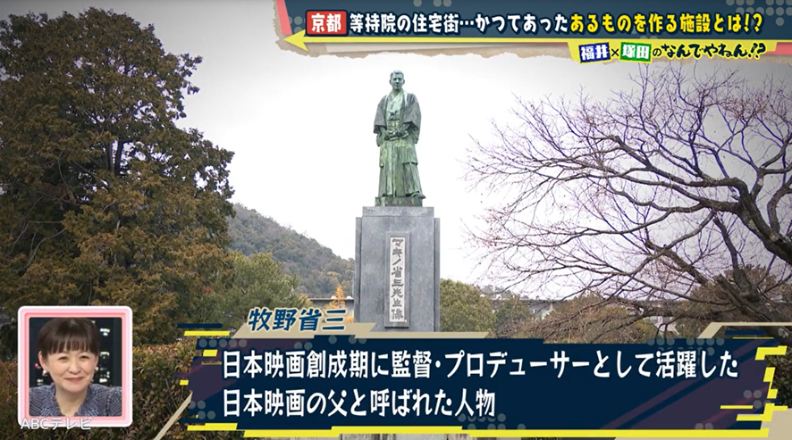 しかしその結果は、100点満点中0点! 塚田と福井アナが見つけるべきだったのは、二条城撮影所跡だ。その説明版には、「日本映画の父と言われる牧野省三」「牧野はその後、京都を舞台に数々の名作を手掛けるなど、日本映画発展の基盤が作られた」という記載が! つまり、等持院敷地内の住宅地の前身施設は、映画の撮影場所だったのだ。